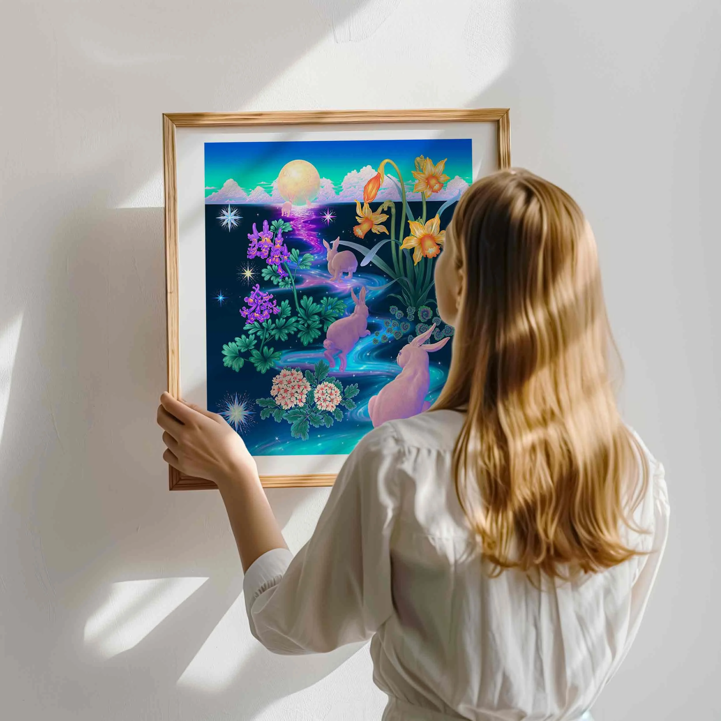 “Mission to the Moon” is a surreal fine art piece capturing the essence of pursuit, ambition, and longing. Set in a dreamlike world, five rabbits leap toward an oversized, glowing full moon, traversing a landscape of luminescent daffodils and imagined flowers. The water beneath reflects floating metal stars, while a mystical aurora guides their journey.